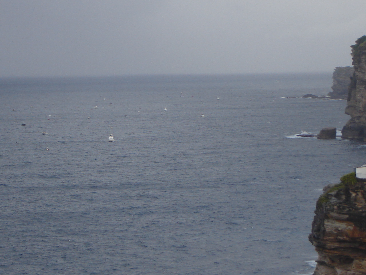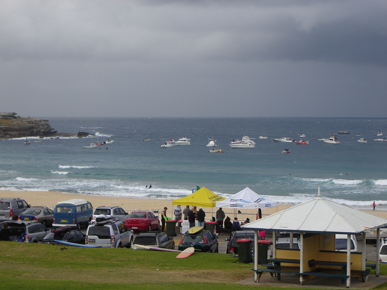 We caught the bus to Bondi. After three weeks of perfect sunny weather the forecast was for coastal showers. When we arrived at the beach we were greeted by the sight of all the boats for the swim sitting in the bay. As I stood on the beach wishing good luck to all the swimmers, the boats moved 500 m or so offshore to wait for their swimmers. Just before the race started it started to lightly rain.