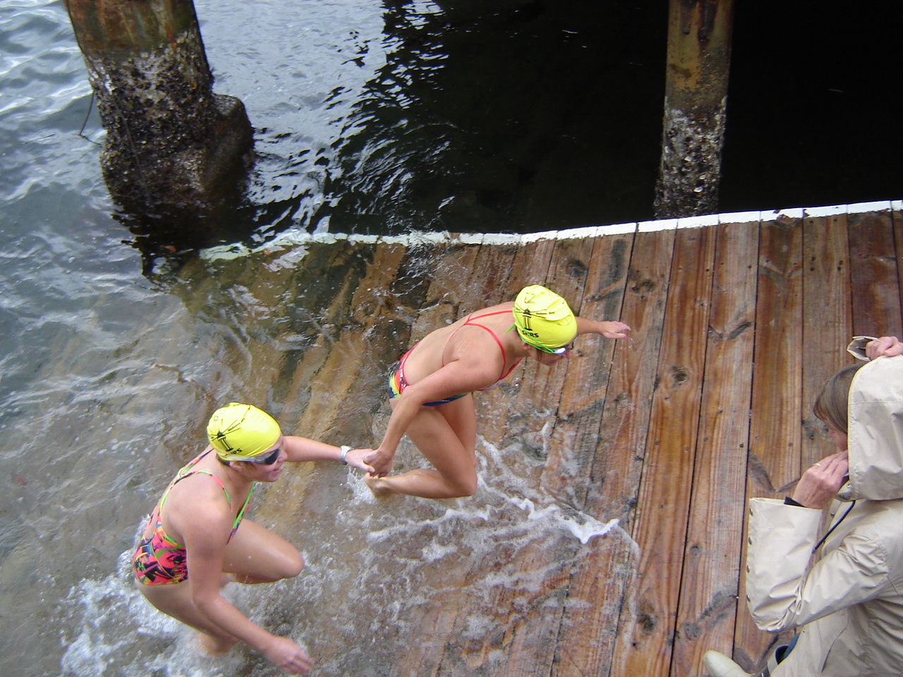 I joined the well wishers at the finish line to watch the swimmers complete their ordeal. Most of the swimmers were clearly quite tired after swimming for three hours or more, and several had trouble making it up the ramp out of the water. I was in awe of those who had made it, either solo or in teams. It is a huge achievement. I was speaking to a friend who has swum the Rottnest Island swim in Perth which is twice as far as this swim, and she thinks this swim is tougher by far, due to the chop and the sea conditions. This year was tougher than normal due to the chop, the rain and the cold air temperature.