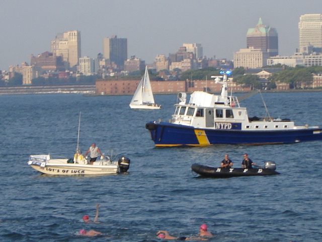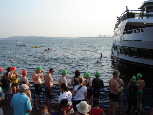 Finally the swimmers briefing took place under the flag pole (with the flag flying at half mast) in the hot sun. I learnt that we could go between the buoys and the working jetty on the Manhattan side of the island, and all other buoys required the swimmers to pass on the right (ie on your left shoulder). The water was cool at 71 degrees F (21.5 C), but to me that would be just like home. There was also a flood tide (ie coming in) which would make the first leg a bit tough swimming against the current. However, the tide was expected to peak at around 7.30 pm so it should not be too bad. Once you got in front of the Lady, the tide would push you.
