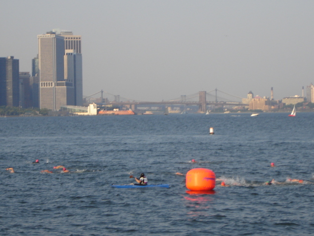 We found some trees to sit under looking towards Manhattan. It was marginally cooler there, but we still had two hours to kill before the swimmers pre-race meeting at 5.30 pm. I decided to walk around the island to examine the course. Wow it was so hot in the sun, and so many of the tourists had no hats on. While I was walking around the buoys for the race were being put in position. They were quite close to the island which was good. When I had listened to the webinair swimmers briefing on Thursday I learnt we had to keep the buoys on our left shoulder all the way round.