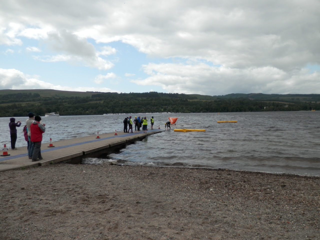 I drove up the A82 to Balloch as the sun started to reassert its presence. I parked the car and walked past the grounds holding the Highland Games as pipers played their bagpipes. I must be in Scotland. I arrived at the registration area for the swim as the presentation was being made for the aquathlon. So while that went on I wandered down to the shores of the loch and looked at the course.
