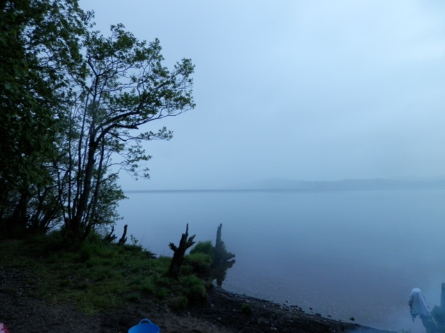 The arrival point for this swim was on the western shores of Loch Lomond at a wee beach, a short five-minute walk from where we parked our cars. When I arrived there was already a dozen cars in the lay-by and we all chatted as swimmers do in the pre-dawn twilight. We all picked up our bags to carry our swim gear, wet weather gear and breakfast food, and walked down the wet track. We picked our way to the beach and I was met with the scene above of a calm Loch Lomond with low clouds hugging the surrounding hills. It really was magical to be in this place at such an early hour.