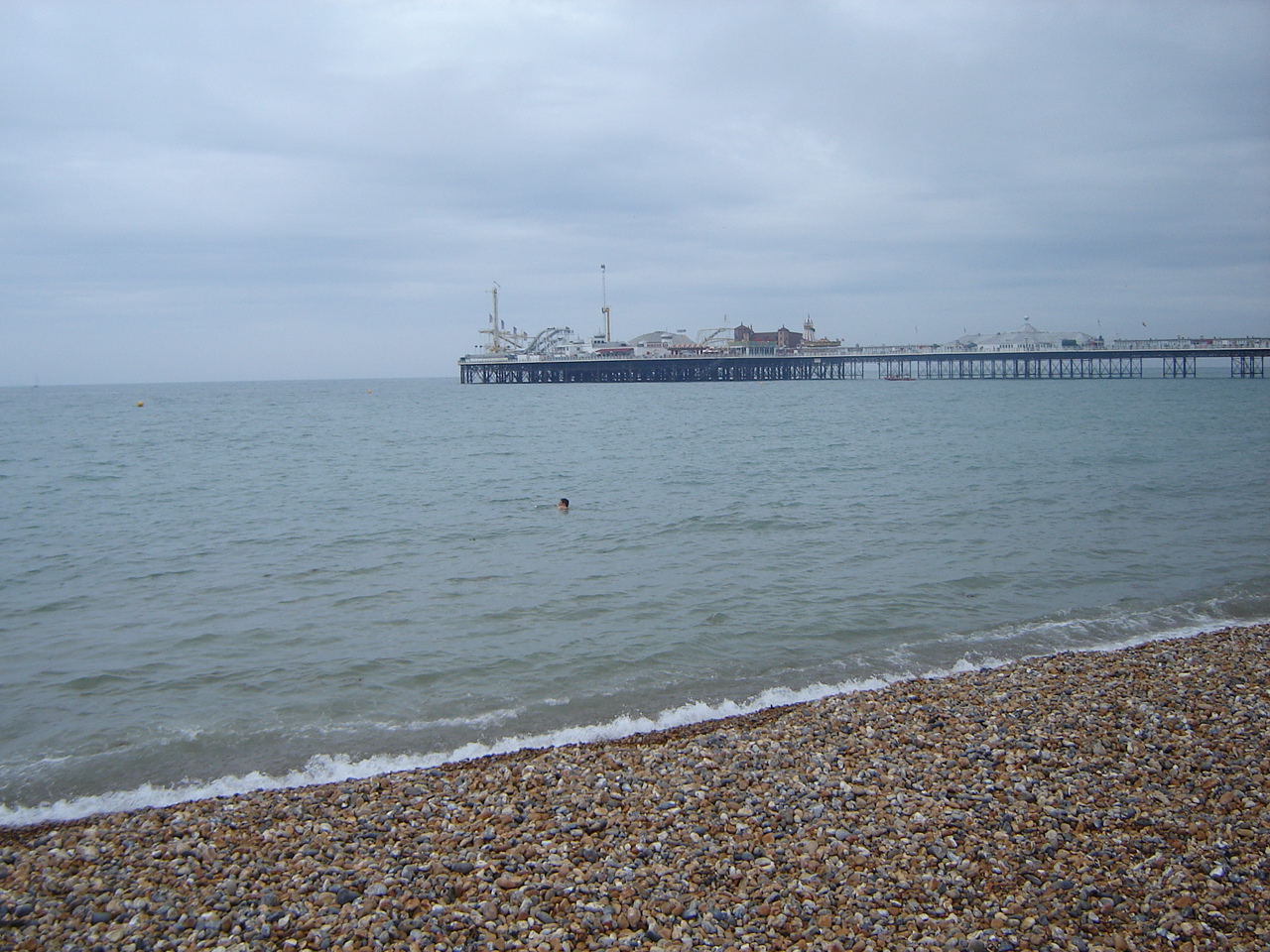 I also swam at Brighton in early July and the water was a lot warmer there, though the pebbles sure were hard on the feet. In both places I was the only person swimming.